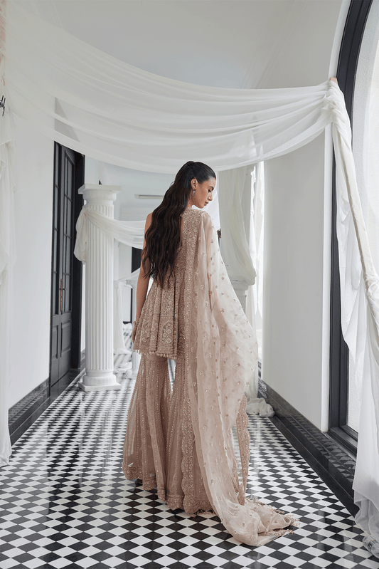 BEIGE SELF ON SELF PEPLUM-SHARARA SET