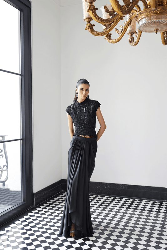 BLACK SELF ON SELF TOP WITH DRAPE SKIRT
