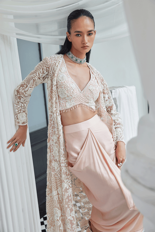 This collection captures the essence of movement and structure — where our fluid drapes and thoughtful patterns echo the effortless flow of water, while intricate hand embroidery, geometric patterns, floral motifs, and delicate cutwork ground each piece, much like the land shaping the river’s course. From sculpted corsets to ethereal sarees and modern Indo-western sets, every silhouette embodies contrast — soft yet defined, fluid yet structured.