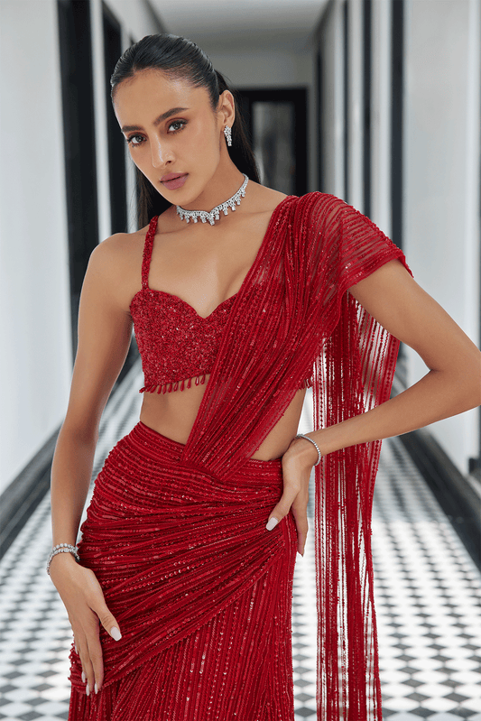 RED DRAPE SAREE WITH A SLIT SKIRT