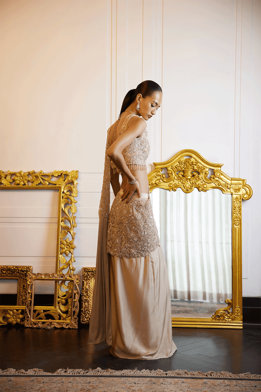 BEIGE SELF ON SELF PEPLUM-SHARARA SET