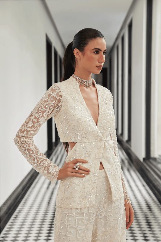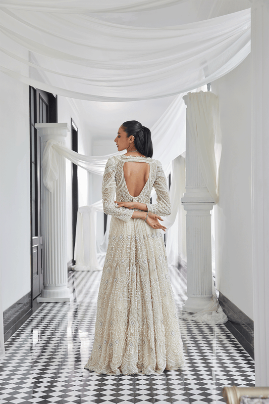 IVORY PEARL AND STONE EMBELLISHED JACKET GOWN SET