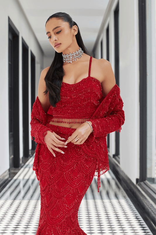 RED ON RED FISH CUT LEHENGA WITH A SHORT JACKET