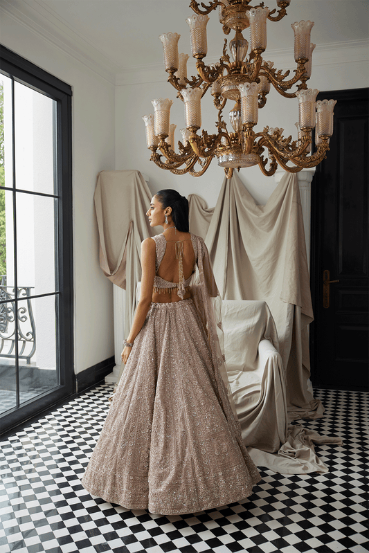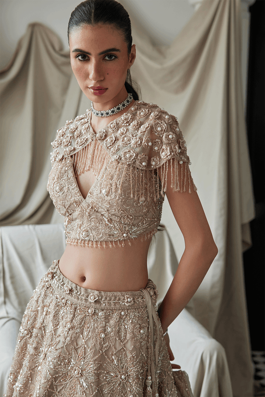BEIGE LEHENGA WITH AN EMBELLISHED SHOULDER CAPE