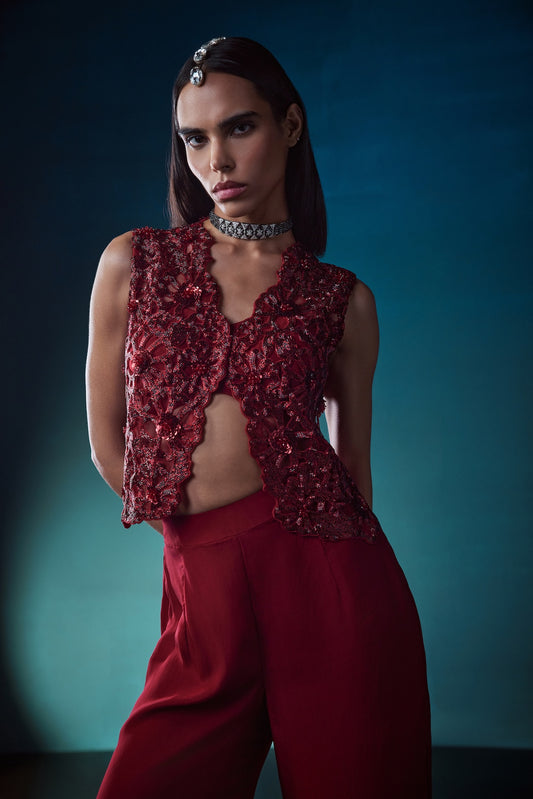 RED INDOWESTERN JACKET SET WITH FLAIRED PANTS
