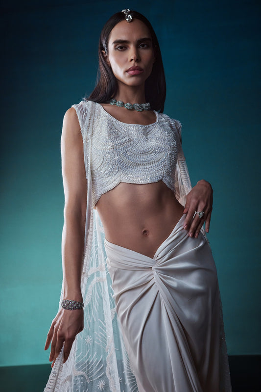 IVORY INDOWESTERN JACKET SET WITH DRAPED SKIRT