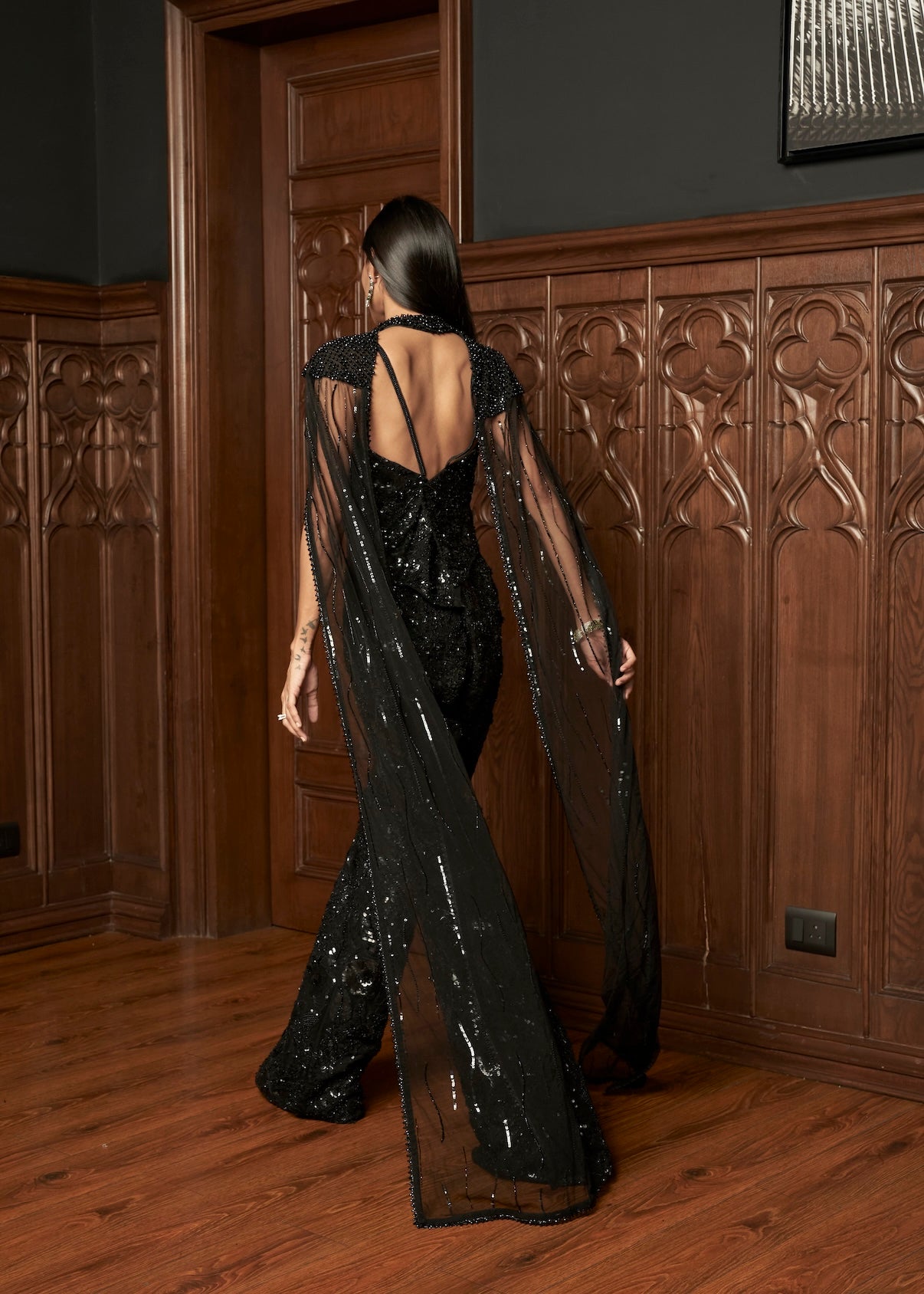 Black embroidered Corset top, paired with heavy pants and a shoulder cape with a veil