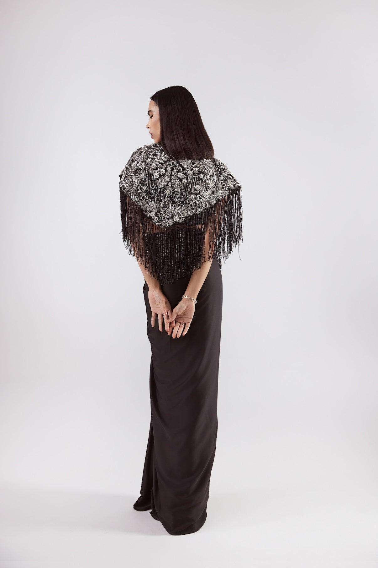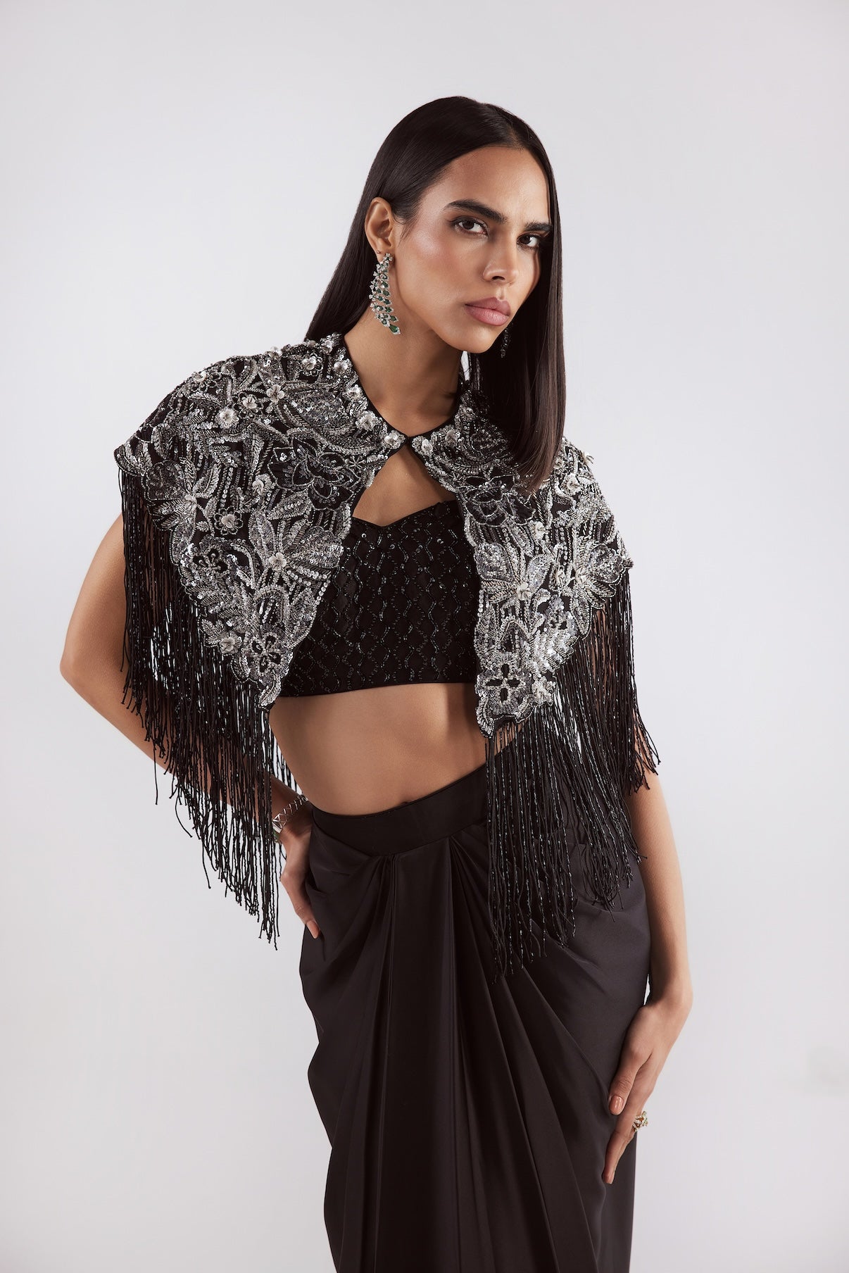 Black cape set with grey patchork work and hand tassels, paired with embroiderd bustier and plain satin drape skirt