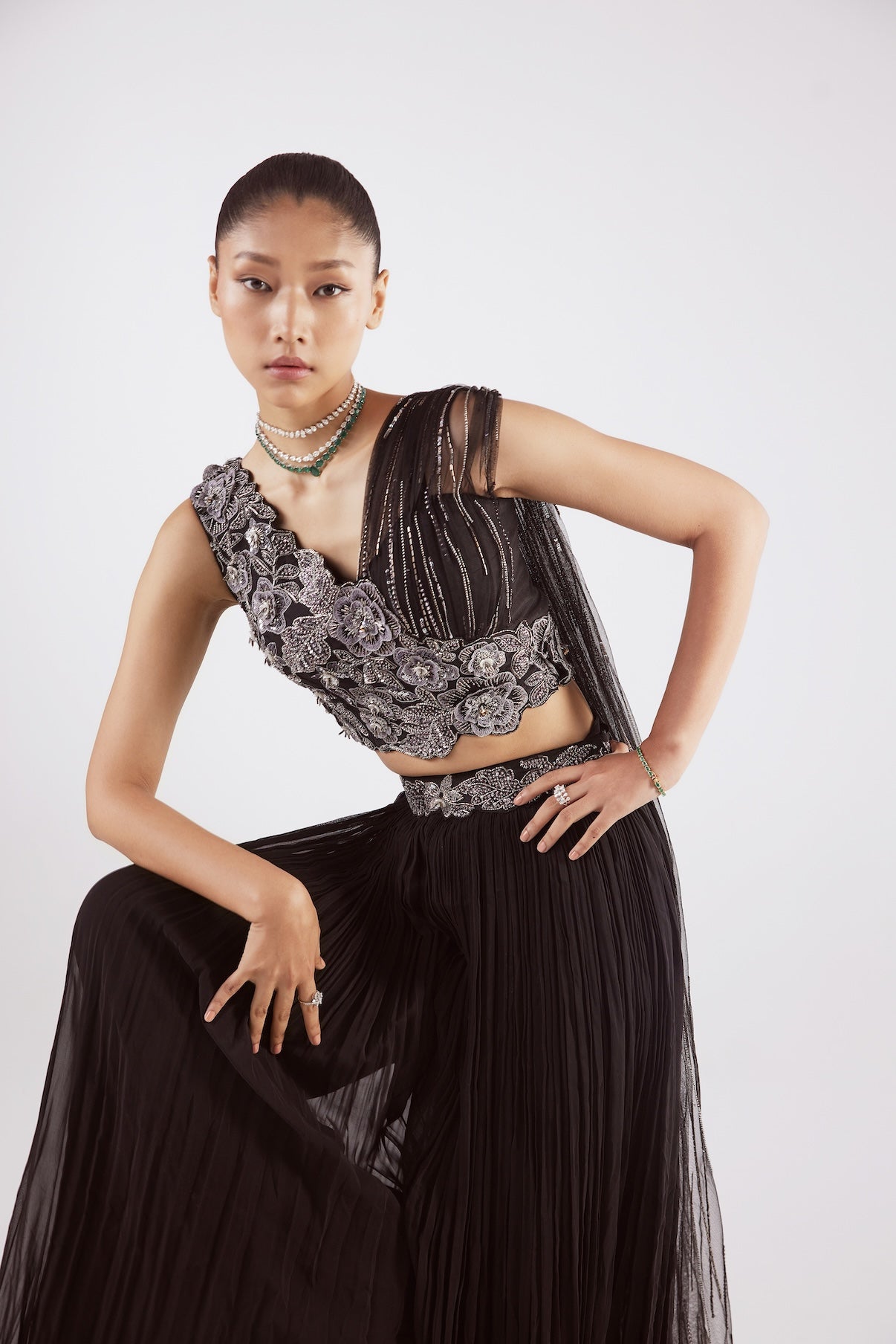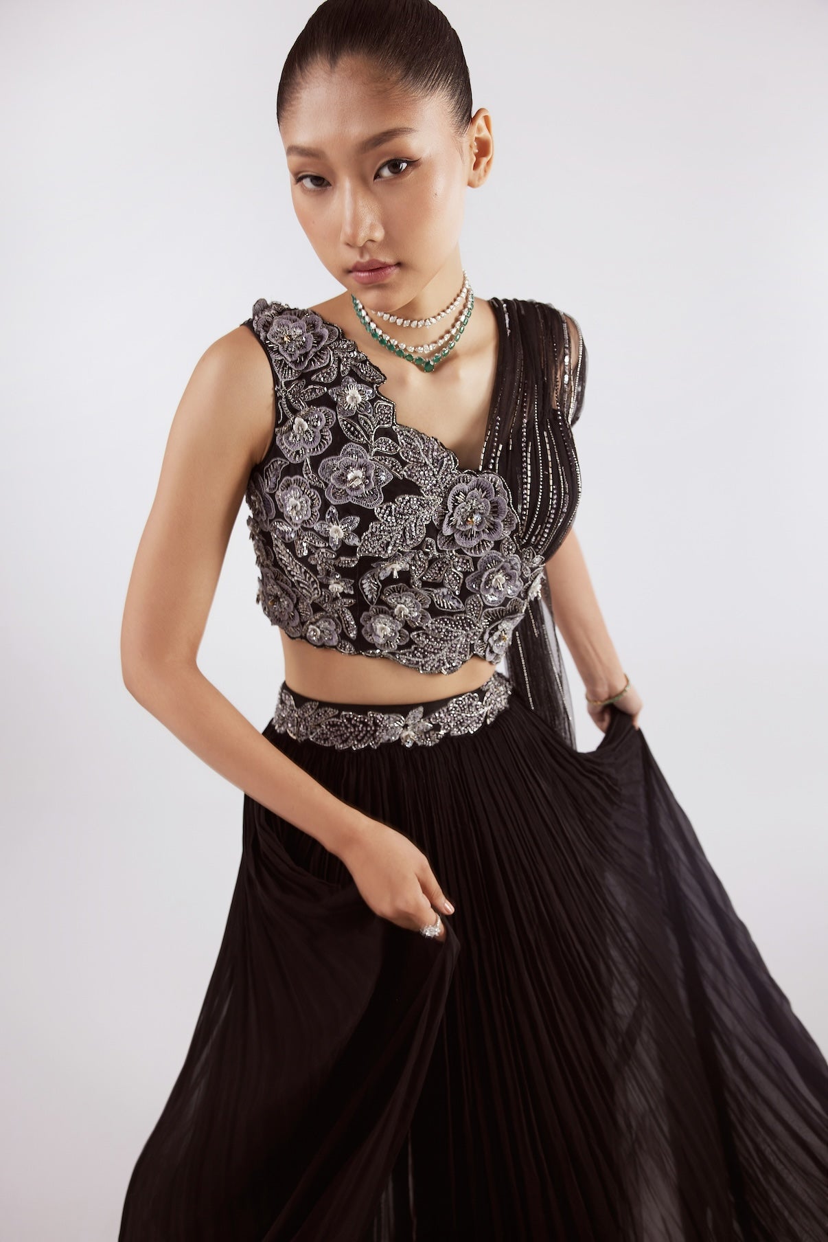 Black georgette indowestern set with grey patchworks on the bustier and belt styled with plain skirt and saree trail