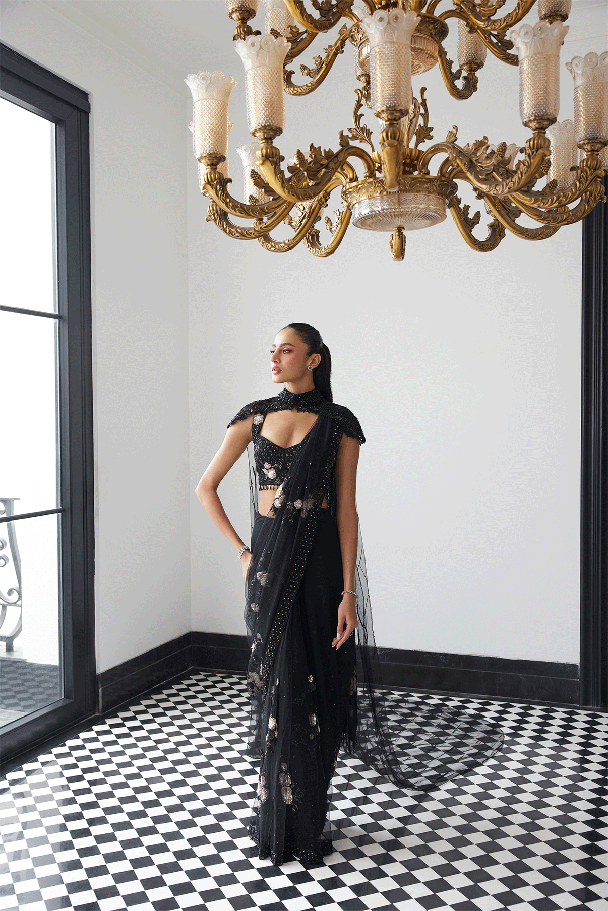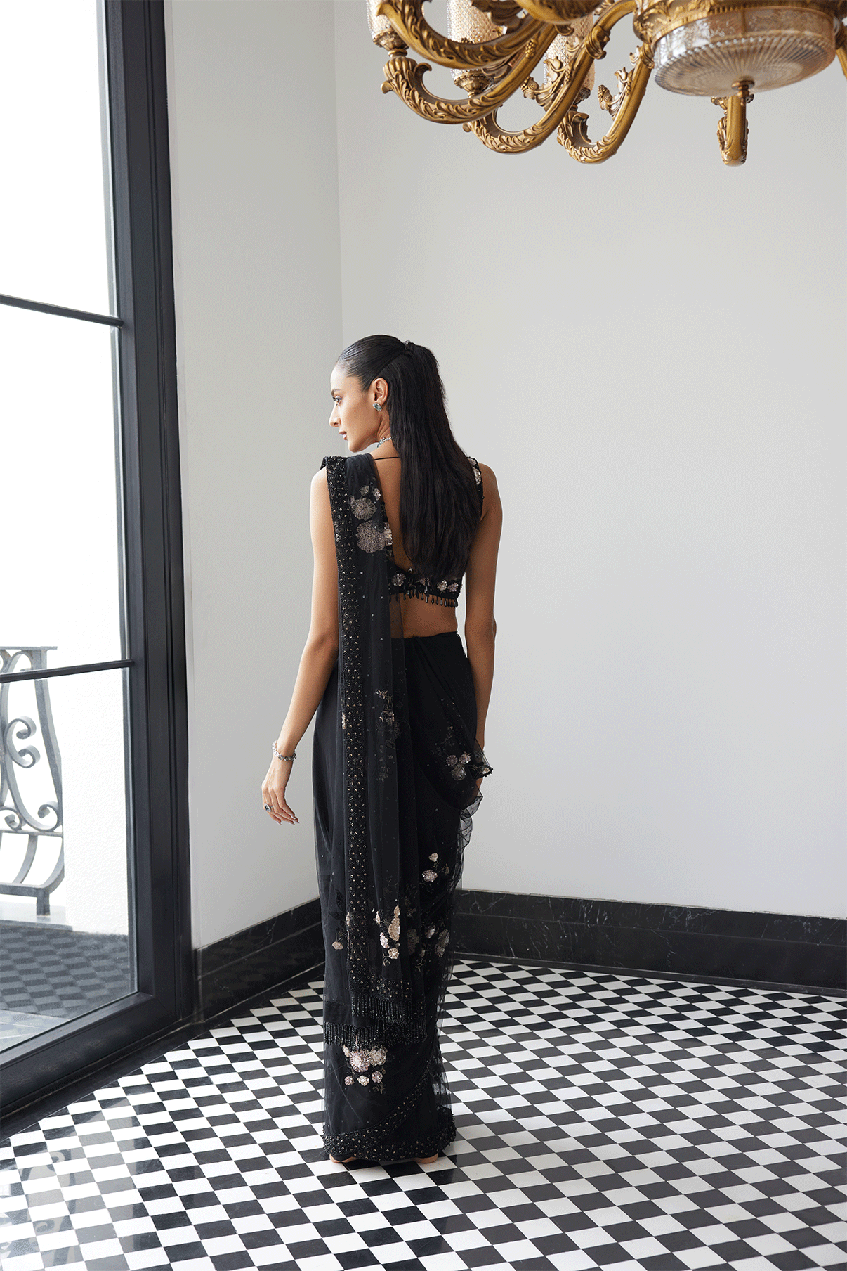 BLACK PATCHWORKED SAREE WITH A VEIL