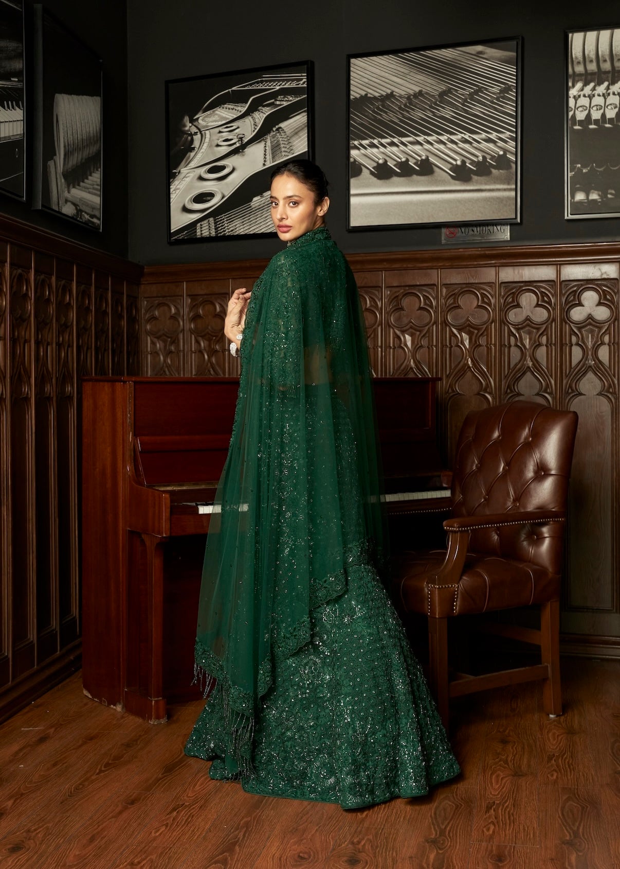 Emerald fischut lehenga set on net, embroidered with thread, cutdana and sequins in geometrical and floral patterns, paired with a stylish blouse and a net dupatta