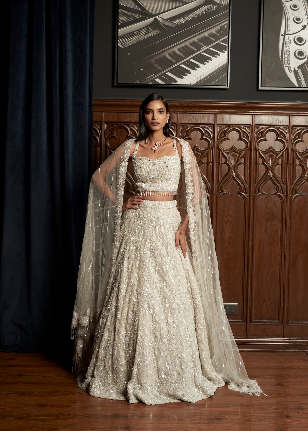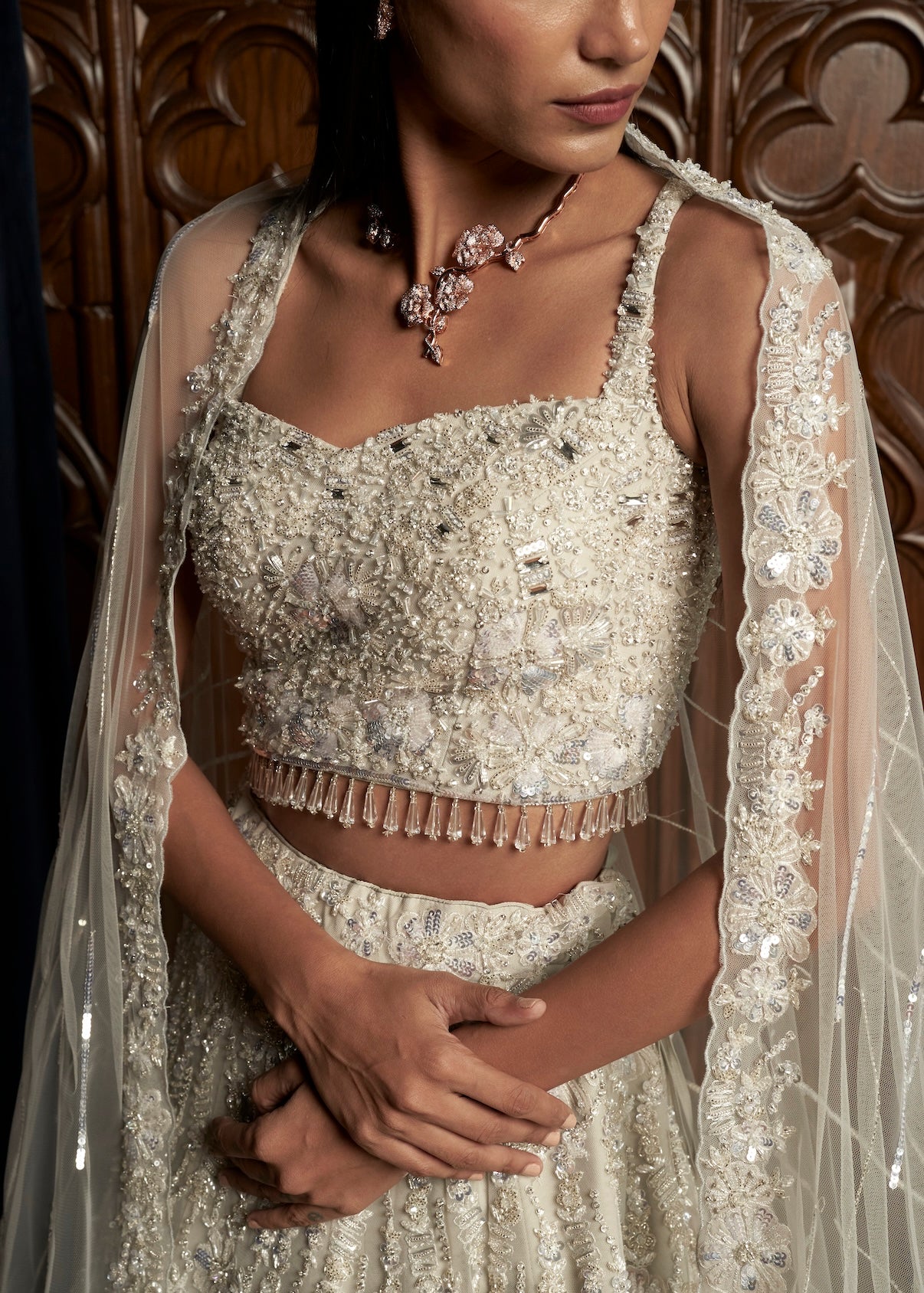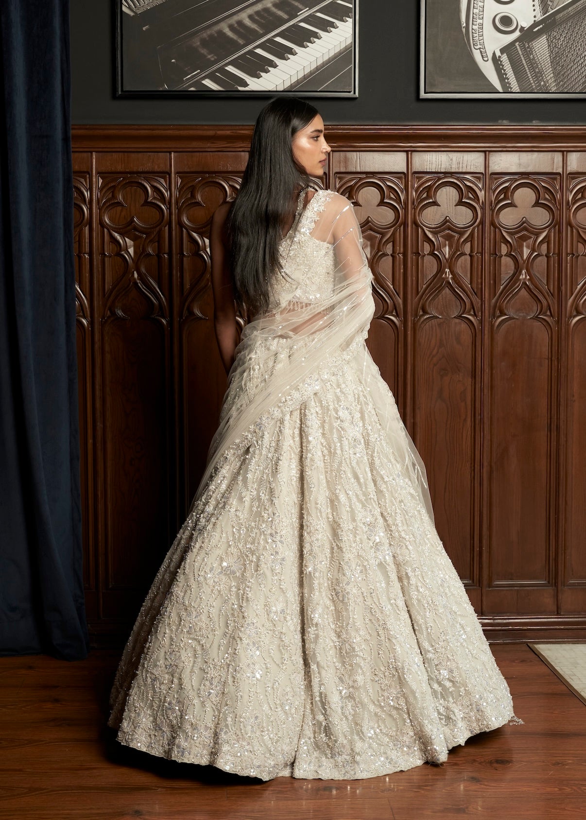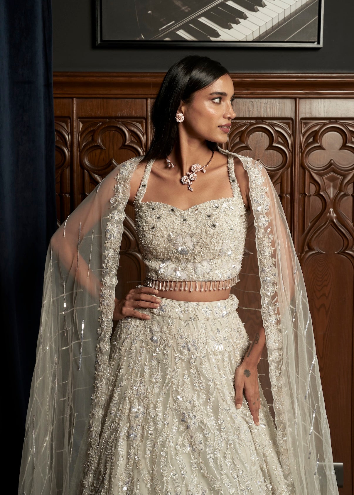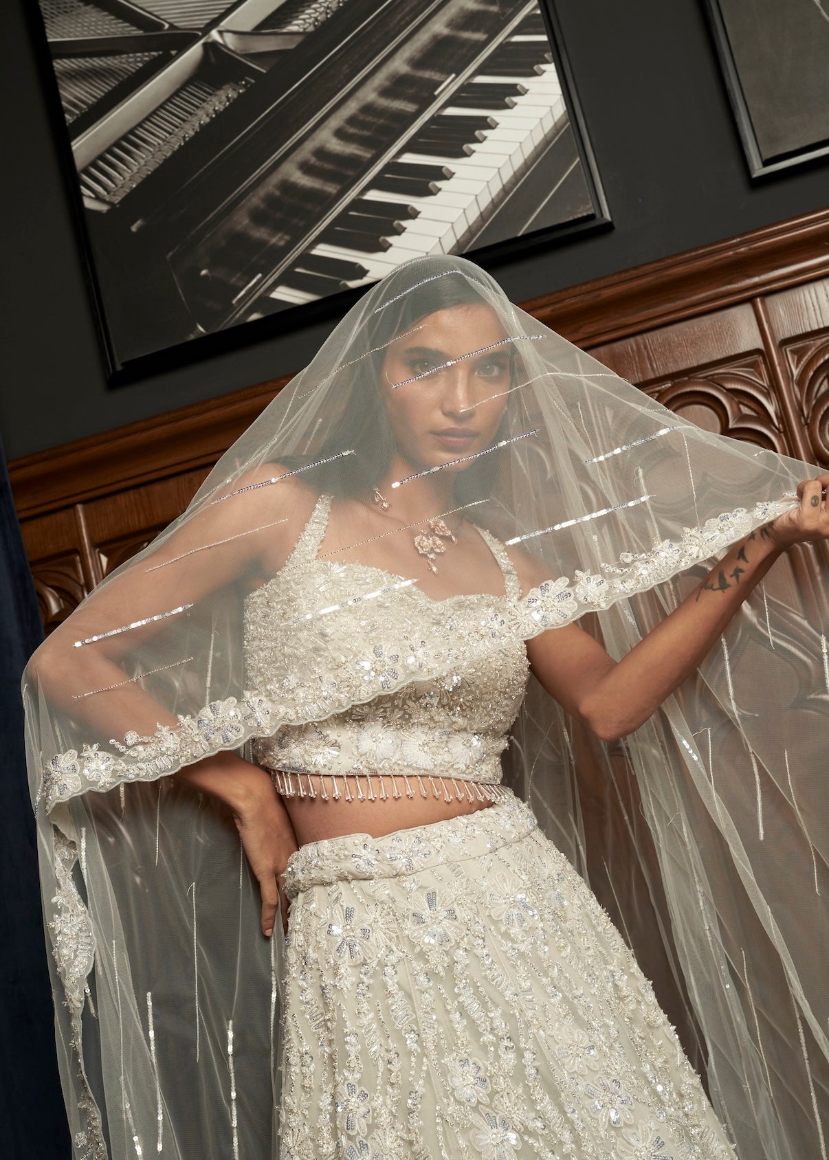 Grey lehenga set with heavy blouse and net dupatta. It has all over applique embroidery with stones, cutdana and sequins