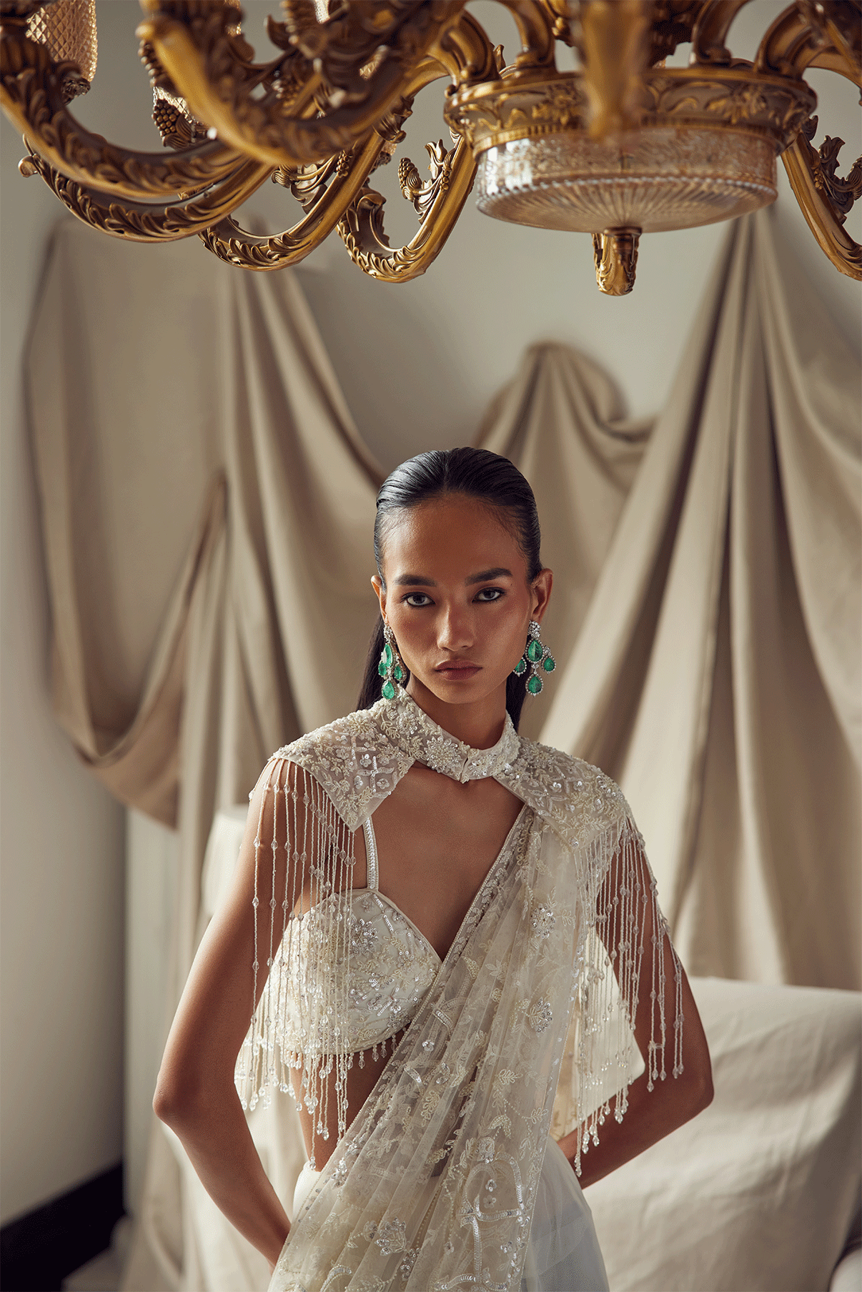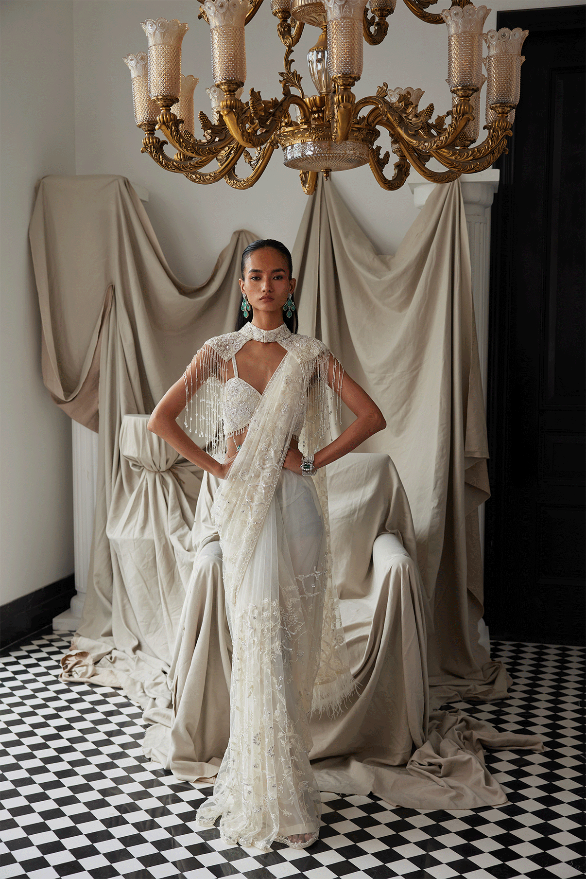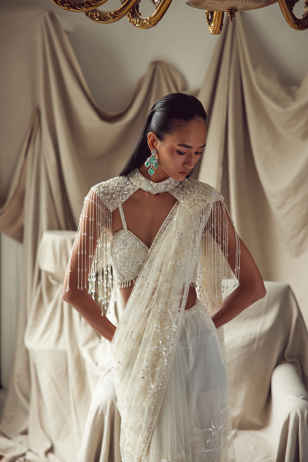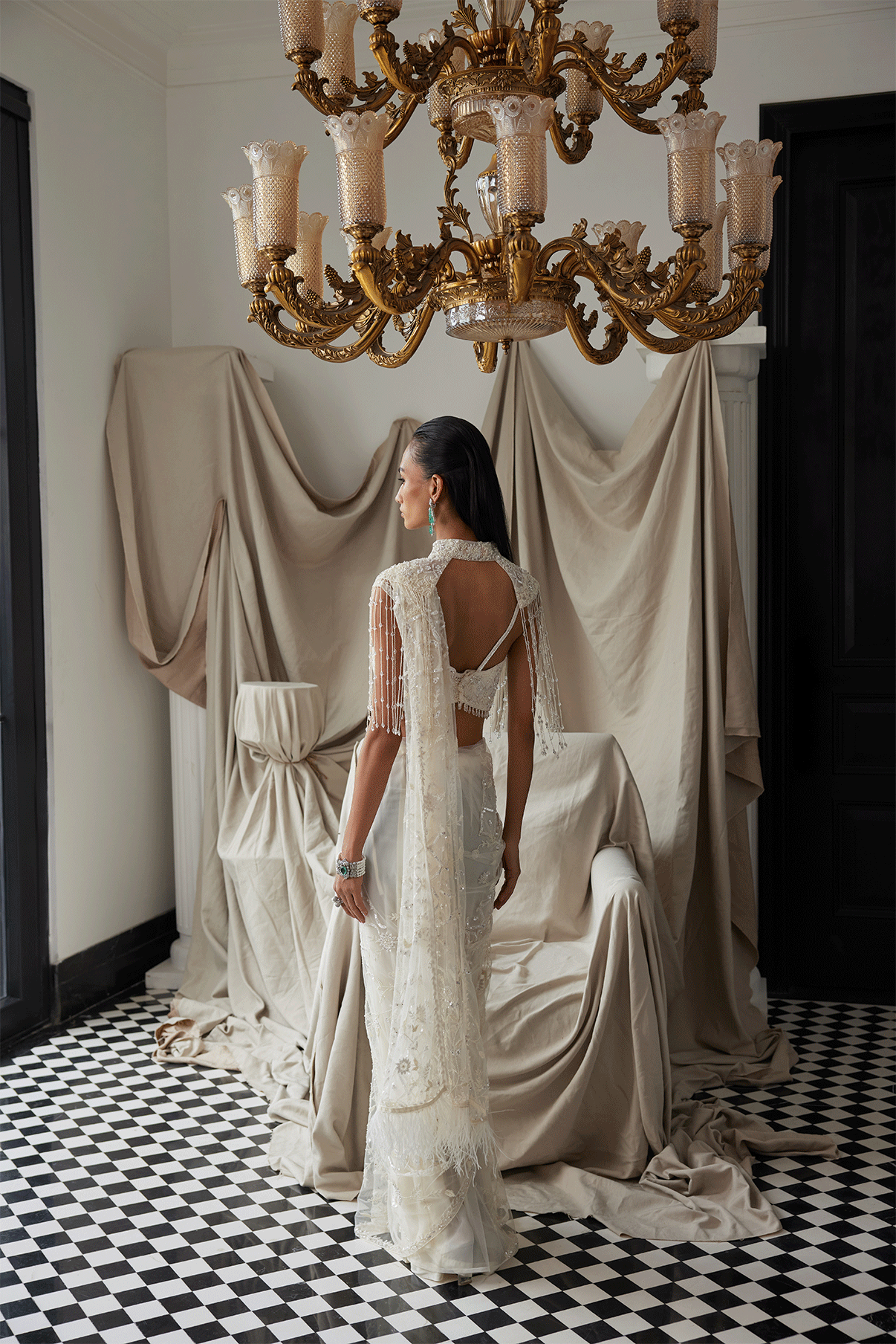 IVORY COCKTAIL SAREE WITH A SHOULDER CAPE