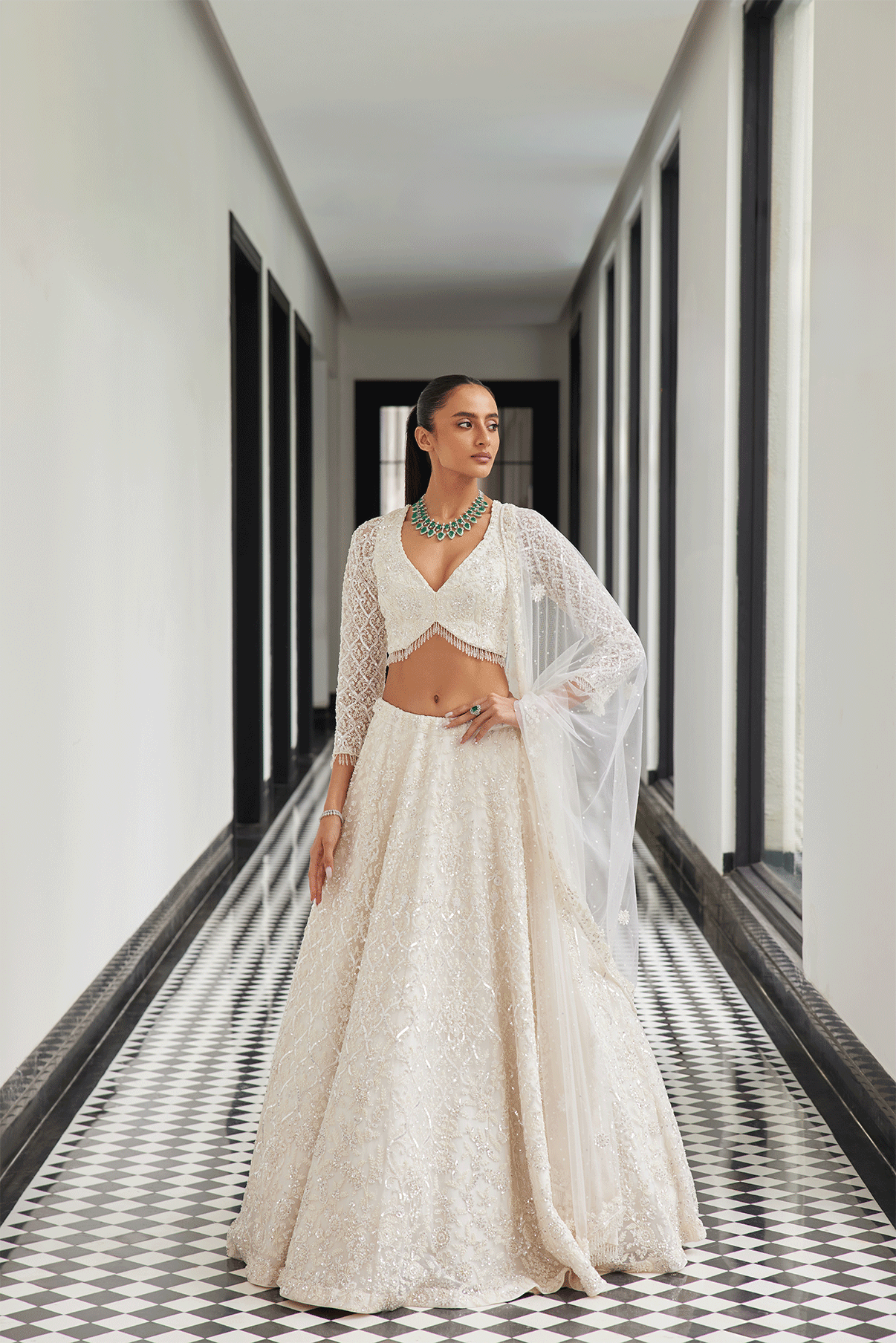 Ivory self on self net lehenga embellished with cutdanas and sequinz, paired with a heavy blouse and dupatta.