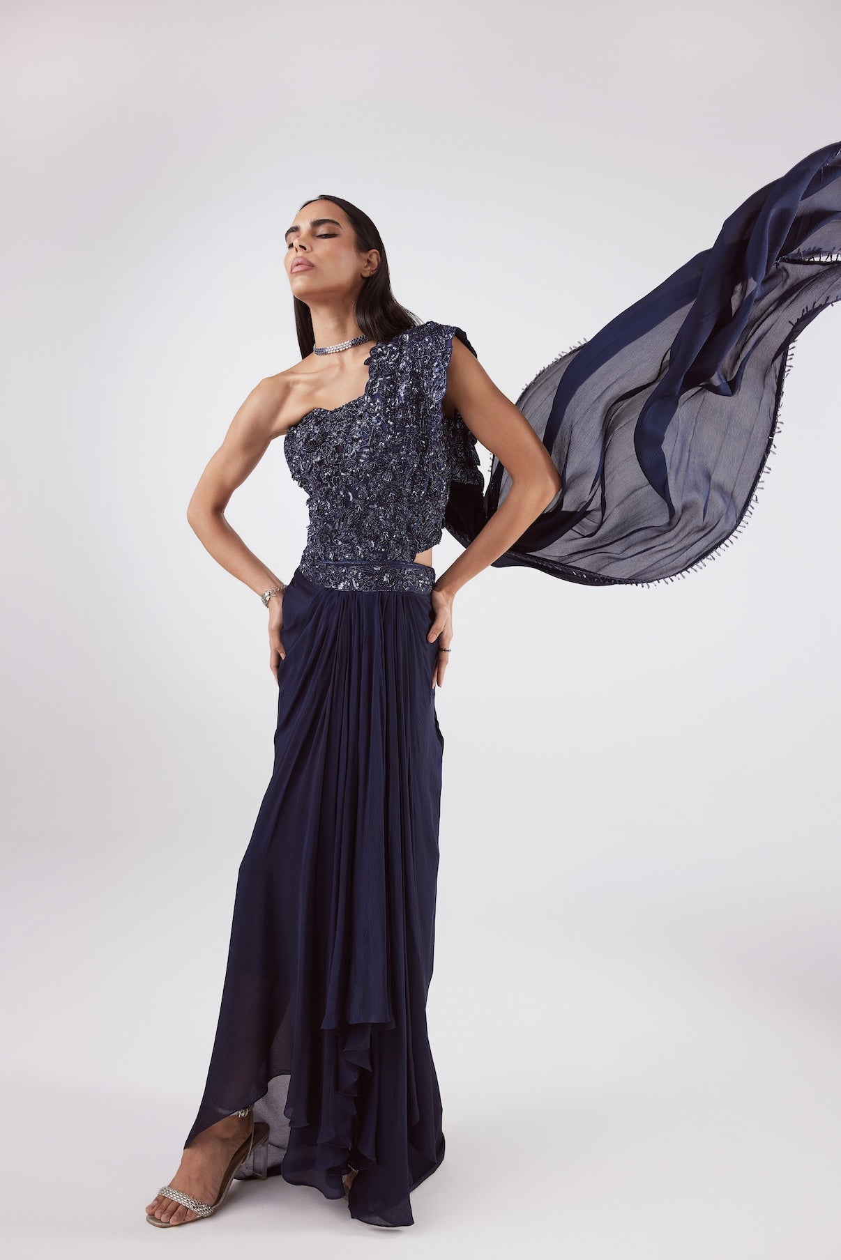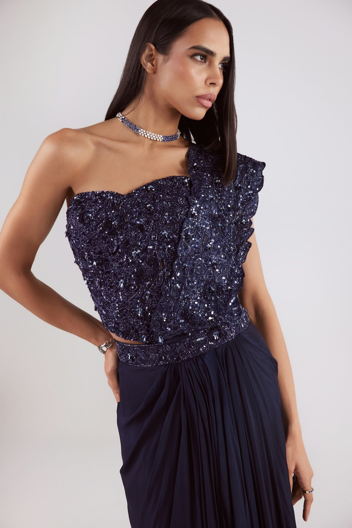 Navy hand embellished corset blouse paired with chinon drape saree with tonal sequins-cutdana embroidery on the top