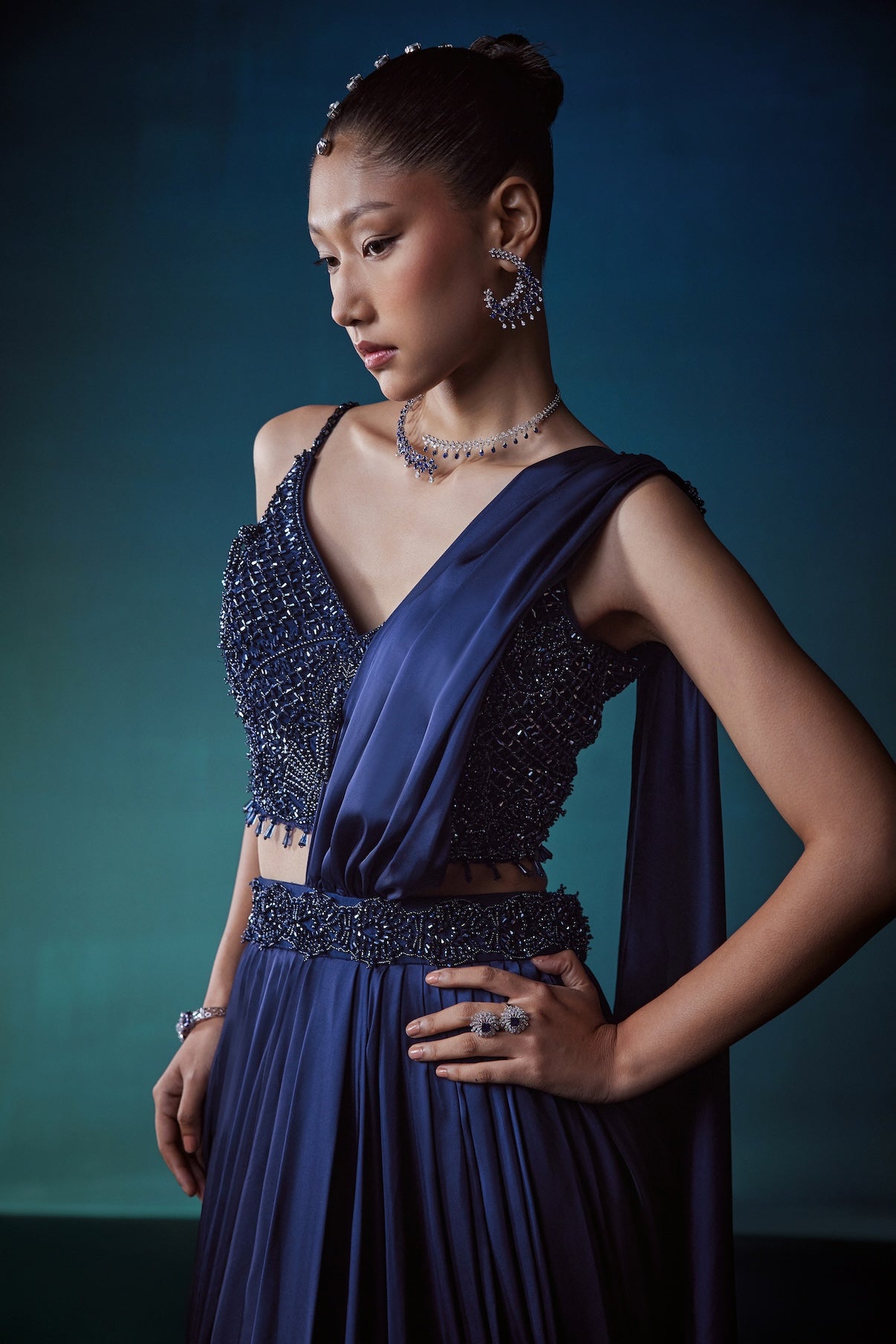 NAVY DRAPE SAREE WITH CRYSTAL STUDDED BLOUSE