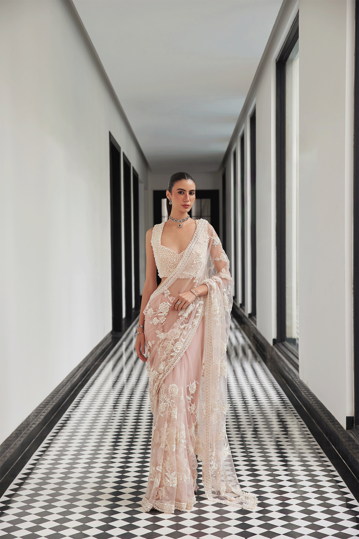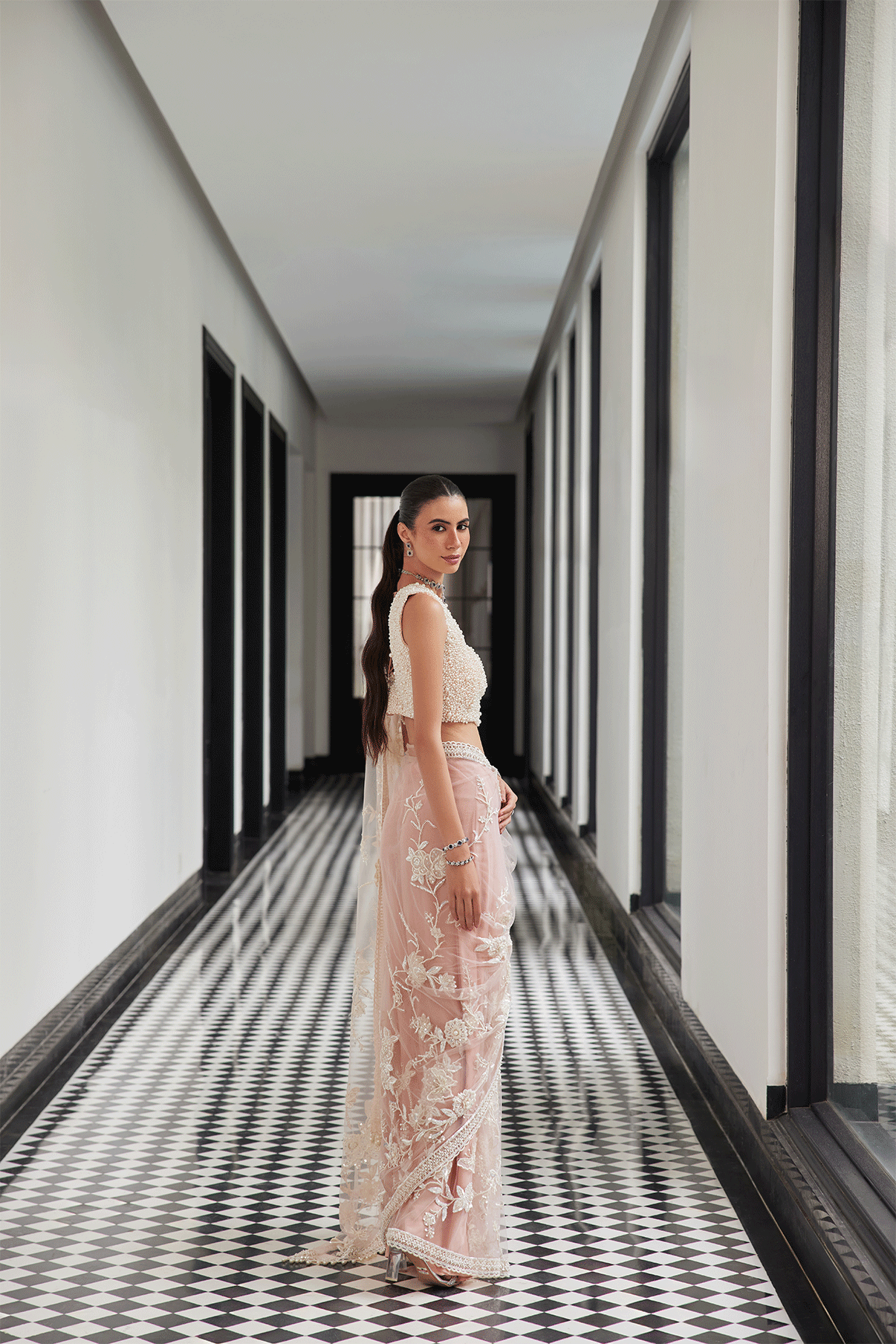 PINK SAREE WITH PEARL EMEBELLISHED BLOUSE