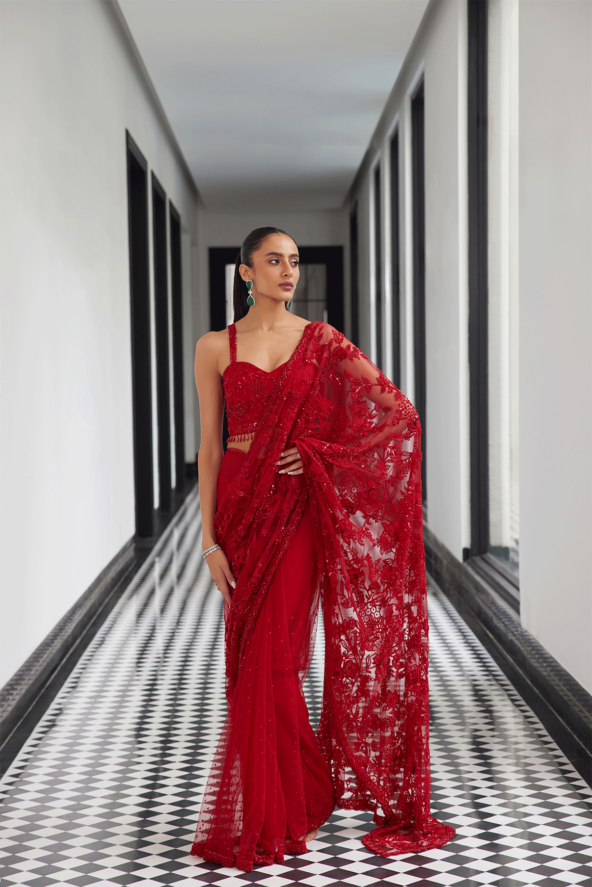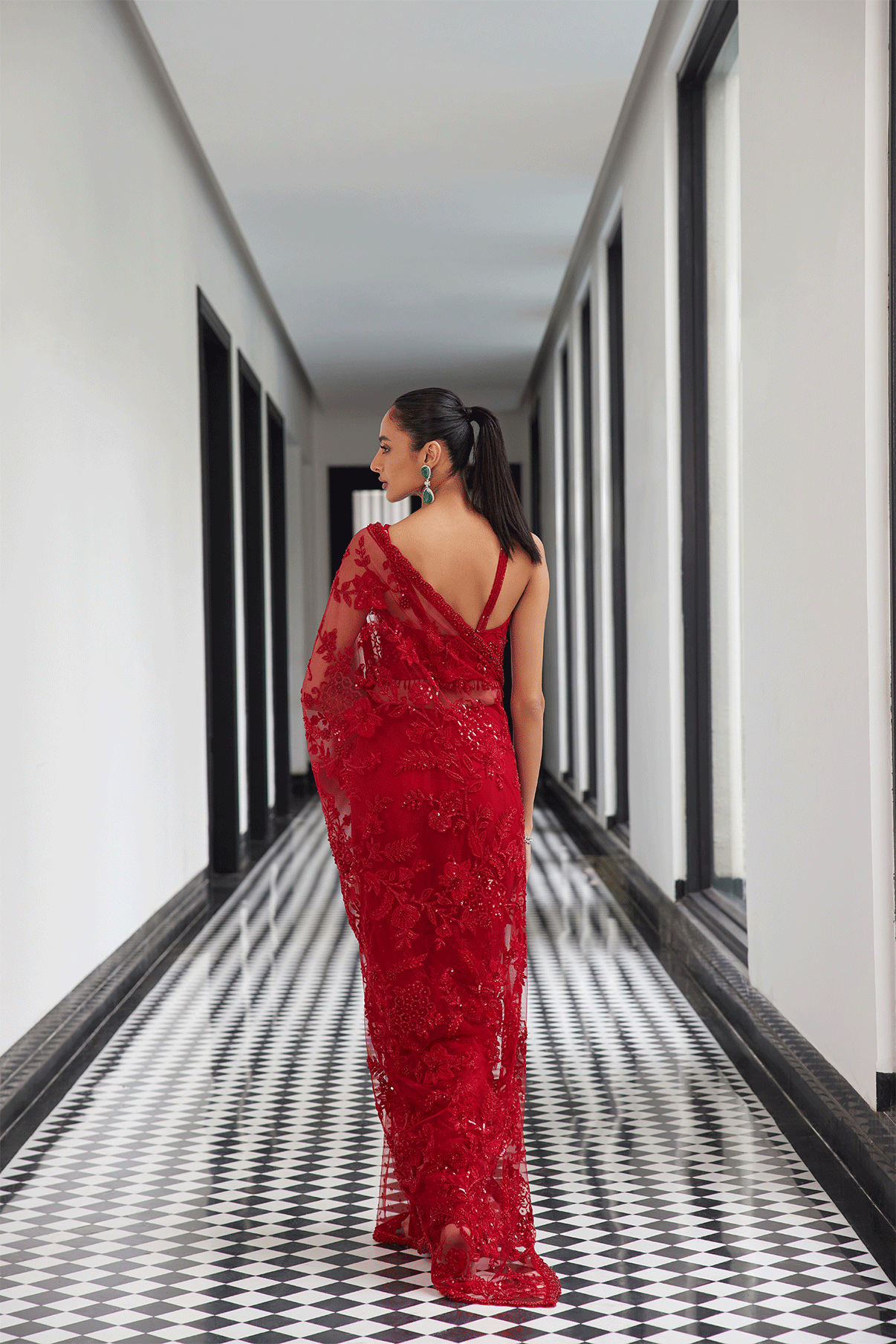 Red net saree with floral and goemetrical motifs, embelished with sequins work paired with an embriodered blouse.