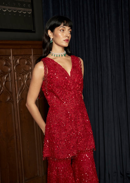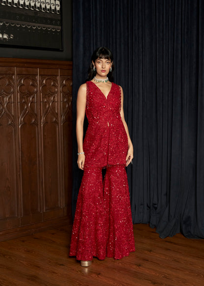 Red net sharara set with all over floral and goemetrical motives, embelished with thread, sequins, cutdana embroidery, paired with a heavy net dupatta